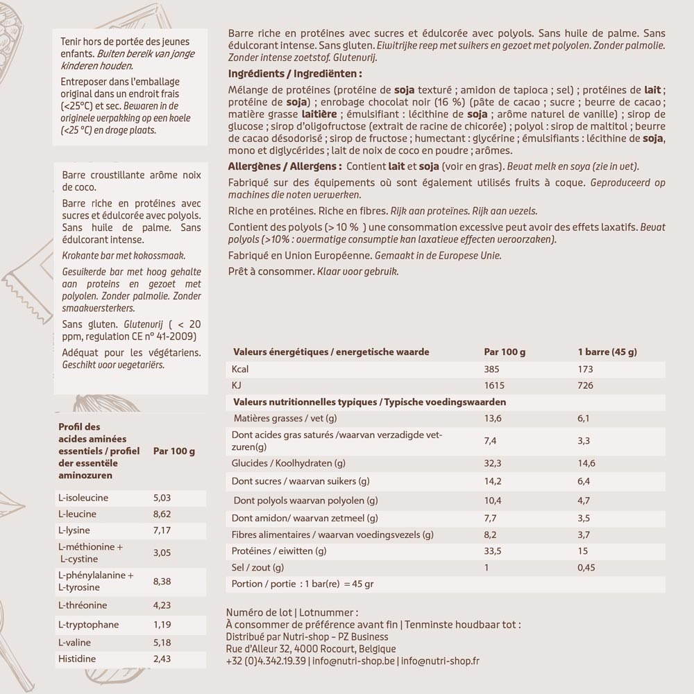 Les barres Nutri-Shop représentent une solution pratique car faciles à transporter, faibles en calories, riches en protéines, aux recettes savoureuses, rapides à manger. Vous pouvez consommer la barre chocolat au petit-déjeuner, au dessert du déjeuner ou du diner, ou bien encore comme goûter lors des petites fringales.